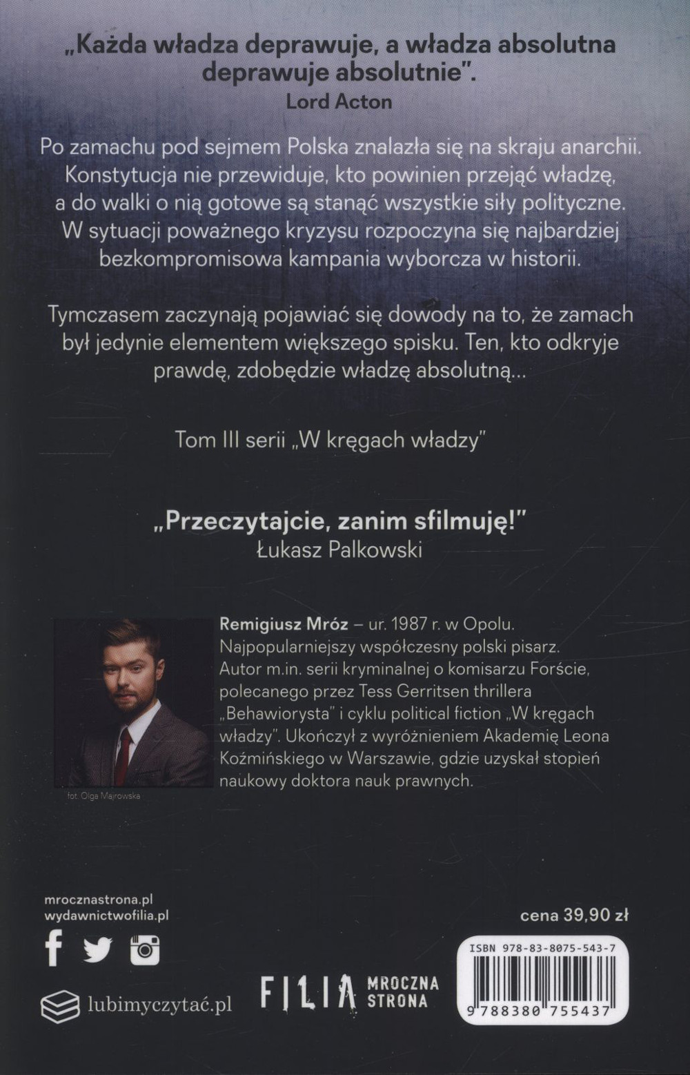 Ale tę awersję pewnie wzbudziła we mnie nasza rodzima scena polityczna 😉 Za to mimo pierwotnego uprzedzenia książka podobała mi się 👍 Dobre tempo akcji, zaskakiwanie czytelnika i zakończenie- to wszystko świetnie zagrało. (...) Szkoda, że zaczęłam od ostatniej części z serii, ale mam w planach nadrobić pozostałe.