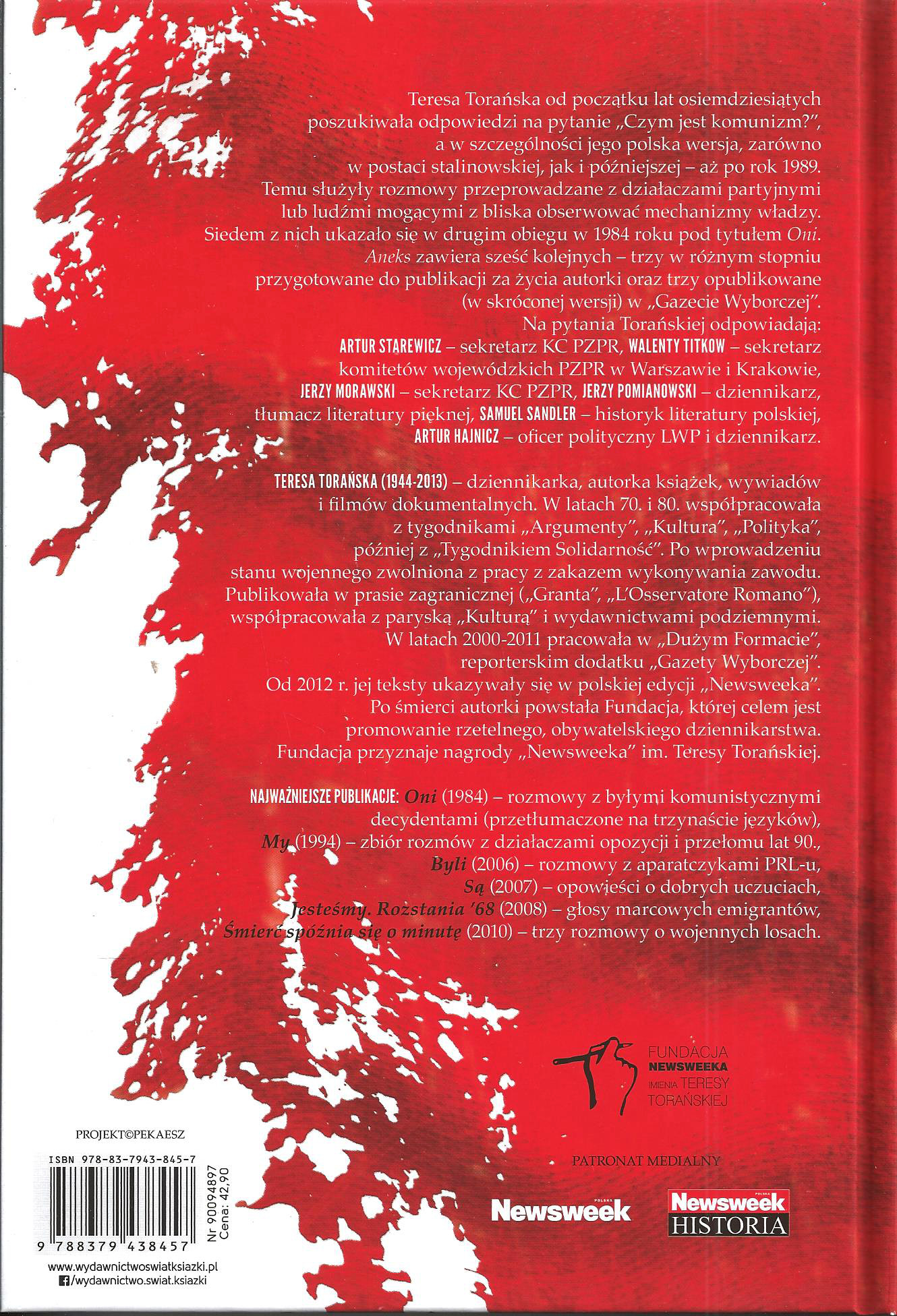 W 1985 r. w drugim obiegu ukazała się książka zatytułowana "Oni", zawierająca zapis siedmiu rozmów z działaczami partyjnymi lub ludźmi będącymi blisko władzy. Celem Teresy Torańskiej było znalezienie odpowiedzi na pytanie "Czym jest komunizm?", a zwłaszcza jego polska wersja. W "Aneksie" czytelnicy znajdą sześć kolejnych wywiadów, z których trzy w pewnym stopniu zostały przygotowane do publikacji za życia autorki, a trzy ukazały się w "Gazecie Wyborczej" w skróconej wersji. Rozmówcami Teresy Torańskiej są: Artur Hajnicz - oficer polityczny LWP i dziennikarz, Jerzy Morawski - sekretarz KC PZPR, Jerzy Pomianowski - dziennikarz, tłumacz literatury pięknej, Samuel Sandler - historyk literatury polskiej, Artur Starewicz - sekretarz KC PZPR i Walenty Titkow - sekretarz komitetów wojewódzkich PZPR w Warszawie i Krakowie. [empik.com]