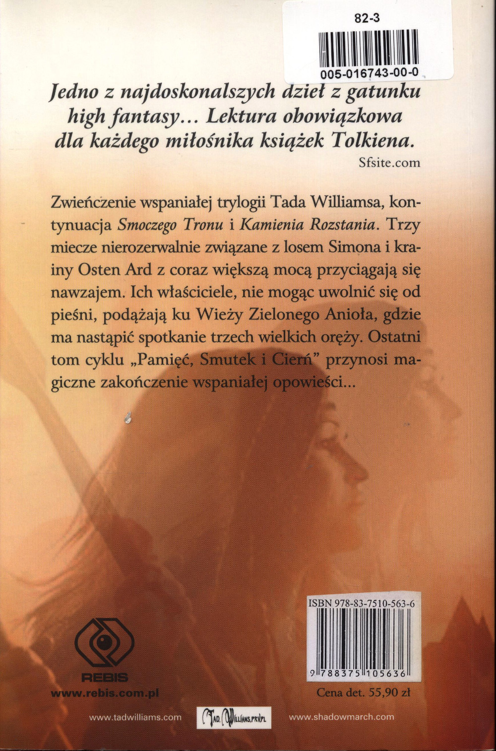 Zwieńczenie wspaniałej trylogii Tada Williamsa, kontynuacja Smoczego Tronu i Kamienia Rozstania. Trzy miecze nierozerwalnie związane z losem Simona i krainy Osten Ard z coraz większą mocą przyciągają się nawzajem. Ich właściciele, nie mogąc uwolnić się od pieśni, podążają ku Wieży Zielonego Anioła, gdzie ma nastąpić spotkanie trzech wielkich oręży. Ostatni tom tom cyklu Pamięć, Smutek, Cierń przynosi magiczne zakończenie wspaniałej opowieści... Źródło: tekst z okładki