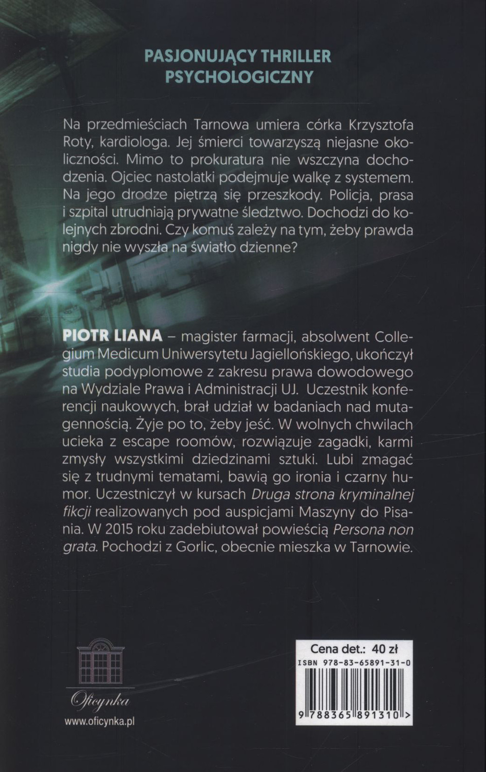 Na przedmieściach Tarnowa umiera córka Krzysztofa Roty, kardiologa. Jej śmierci towarzyszą niejasne okoliczności. Mimo to prokuratura nie wszczyna dochodzenia. Ojciec nastolatki podejmuje walkę z systemem. Na jego drodze piętrzą się przeszkody. Policja, prasa i szpital utrudniają prywatne śledztwo. Dochodzi do kolejnych zbrodni. Czy komuś zależy na tym, żeby prawda nigdy nie wyszła na światło dzienne?[z okładki]