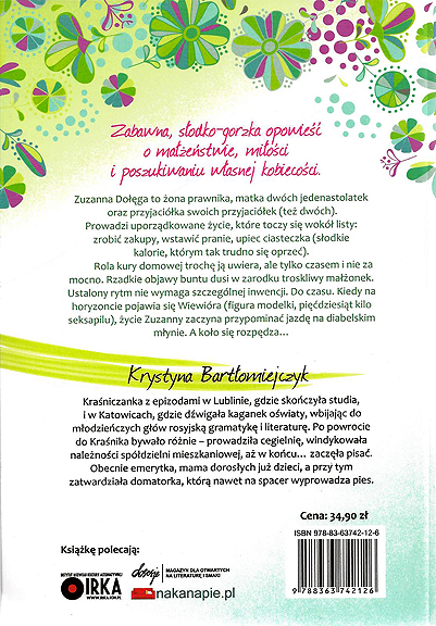 Zuzanna Dołęga to żona prawnika, matka dwóch jedenastolatek oraz przyjaciółka swoich przyjaciółek (też dwóch). Prowadzi uporządkowane życie, które toczy się wokół listy: zrobić zakupy, wstawić pranie, upiec ciasteczka (słodkie kalorie, którym tak trudno się oprzeć). Rola kury domowej trochę ją uwiera, ale tylko czasem i nie za mocno. Rzadkie objawy buntu dusi w zarodku troskliwy małżonek. Ustalony rytm nie wymaga szczególnej inwencji. Do czasu. Kiedy na horyzoncie pojawia się Wiewióra (figura modelki, pięćdziesiąt kilo seksapilu) życie Zuzanny zaczyna przypominać jazdę na diabelskim młynie. A koło się rozpędza… [Prozami, 2014]