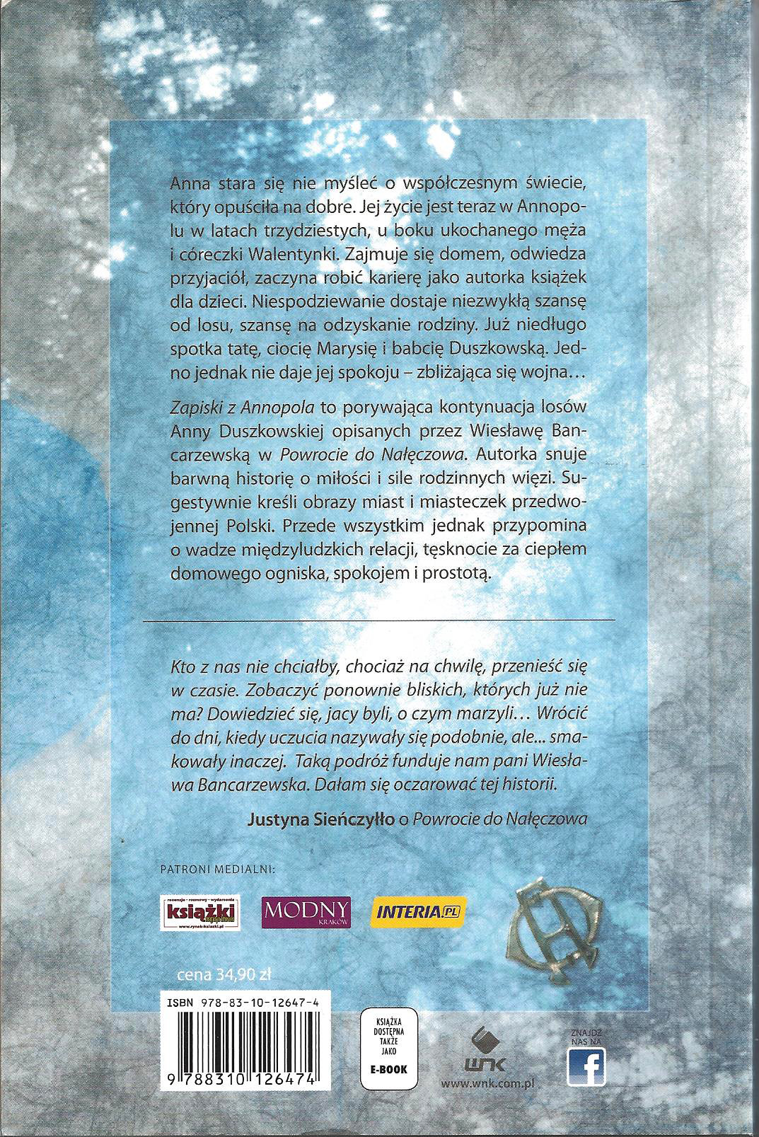 Anna stara się nie myśleć o współczesnym świecie, który opuściła na dobre. Jej życie jest teraz w Annopolu w latach trzydziestych, u boku ukochanego męża i córeczki Walentynki. Zajmuje się domem, odwiedza przyjaciół, zaczyna robić karierę jako autorka książek dla dzieci. Niespodziewanie dostaje niezwykłą szansę od losu, szansę na odzyskanie rodziny. Już niedługo spotka tatę, ciocię Marysię i babcię Duszkowską. Jedno jednak nie daje jej spokoju - zbliżająca się wojna… "Zapiski z Annopola" to porywająca kontynuacja losów Anny Duszkowskiej opisanych przez Wiesłąwę Bancarzewską w "Powrocie z Nałęczowa" Autorka snuje barwną historię o miłości i sile rodzinnych więzi. Sugestywnie kreśli obrazy miast i miasteczek przedwojennej Polski. Przede wszystkim jednak przypomina o wadze międzyludzkich relacji, tęsknocie za ciepłem domowego ogniska, spokojem i prostotą. [Nasza Księgarnia, 2014]