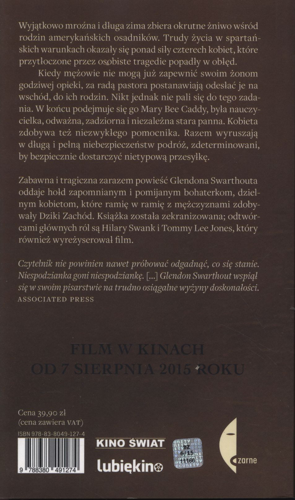 Wyjątkowo mroźna i długa zima zbiera okrutne żniwo wśród rodzin amerykańskich osadników. Trudy życia w spartańskich warunkach okazały się ponad siły czterech kobiet, które przytłoczone przez osobiste tragedie popadły w obłęd. Kiedy mężowie nie mogą już zapewnić swoim żonom godziwej opieki, za radą pastora postanawiają odesłać je na wschód, do ich rodzin. Nikt jednak nie pali się do tego zadania. W końcu podejmuje się go Mary Bee Caddy, była nauczycielka, odważna, zadziorna i niezależna stara panna. Zdobywa też niezwykłego pomocnika. Razem wyruszają w długą i pełną niebezpieczeństw podróż, zdeterminowani, by bezpiecznie dostarczyć nietypową przesyłkę. Zabawna i tragiczna zarazem powieść Glendona Swarhouta oddaje hołd zapomnianym i pomijanym bohaterkom, dzielnym kobietom, które ramię w ramię z mężczyznami zdobywały Dziki Zachód. Książka została zekranizowana; odtwórcami głównych ról są Hilary Swank i Tommy Lee Jones, który również wyreżyserował film. [Wydaw. Czarne, 2015]