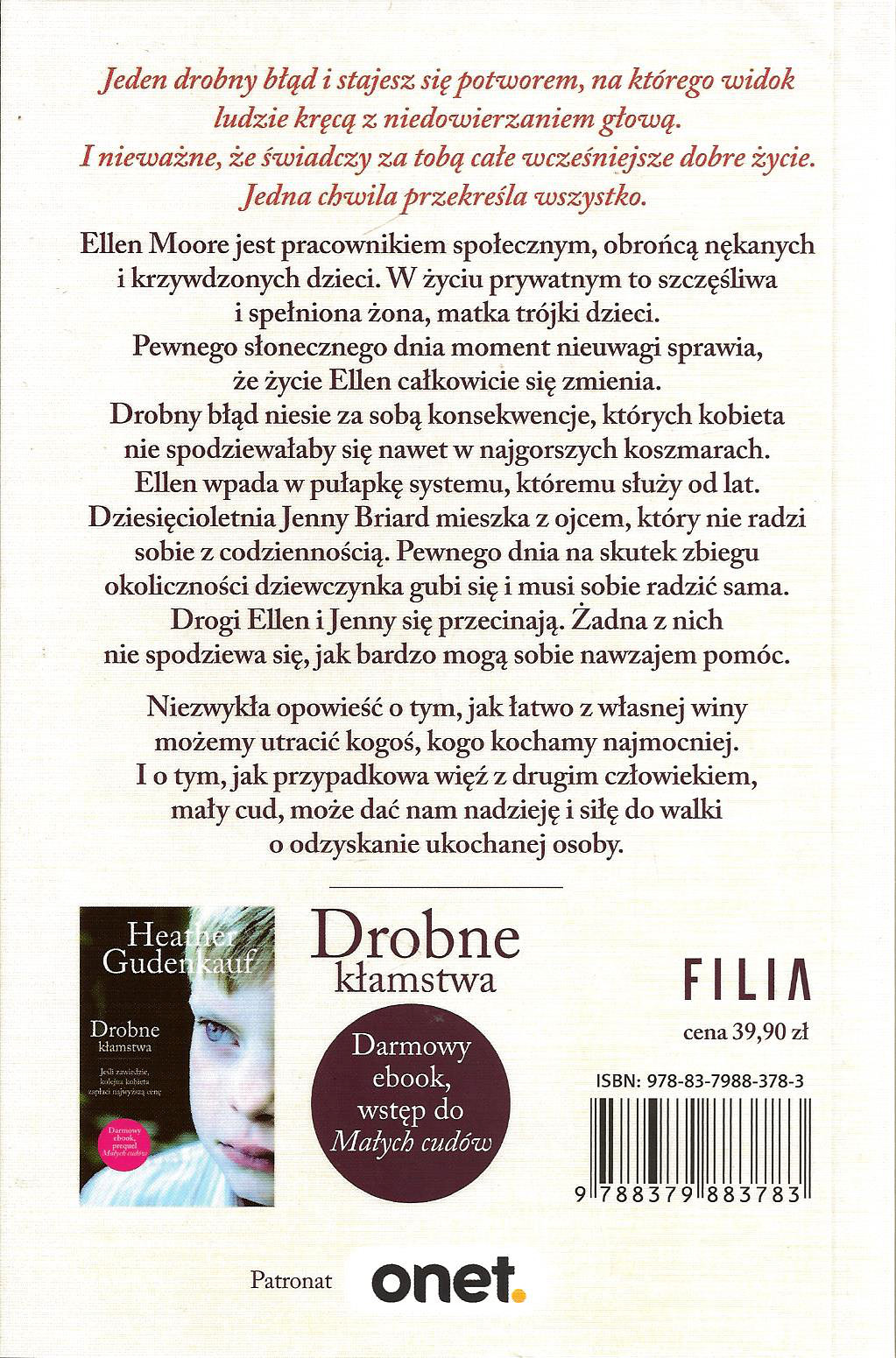 Ellen Morre jest pracownikiem społecznym. Widziała już straszne rzeczy. Najgorsze krzywdy jakie jeden człowiek może uczynić drugiemu człowiekowi. Na co dzień Ellen jest obrońcą nękanych i krzywdzonych dzieci. W życiu prywatnym to szczęśliwa i spełniona żona i matka trójki dzieci. Ale pewnego słonecznego dnia moment nieuwagi sprawia, że kobieta prawie traci kogoś, kogo najmocniej kocha. Drobny błąd niesie za sobą konsekwencje, których Ellen nie spodziewałaby się nawet w najgorszych koszmarach. Kobieta wpada w pułapkę systemu, któremu służy od lat. Dziesięcioletnia Jenny Briard po tym jak odeszła jej matka, mieszka z ojcem, który nie radzi sobie z codziennością. Nieustannie zmieniają miejsce zamieszkania. Pewnego dnia na skutek zbiegu okoliczności dziewczynka, z kilkoma dolarami w kieszeni, gubi się i musi sobie radzić sama. Drogi Ellen i Jenny przecinają się. Żadna z nich nie spodziewa się jak bardzo mogą sobie nawzajem pomóc. Niezwykła opowieść o macierzyństwie, odpowiedzialności i sprawiedliwości. O tym, jak łatwo z własnej winy możemy utracić kogoś, kogo kochamy najmocniej. I o tym, jak przypadkowa więź z drugim człowiekiem, mały cud, może dać nam nadzieję i siłę do walki o odzyskanie ukochanej osoby. [Filia, 2015]