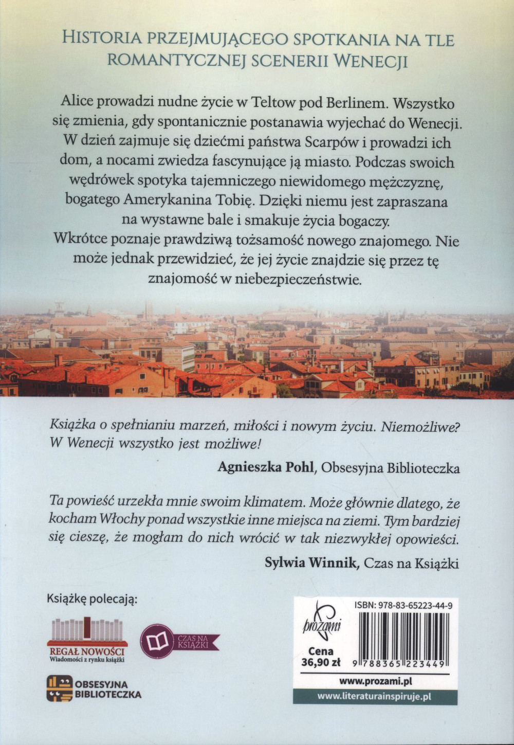 Alice prowadzi nudne życie w Teltow pod Berlinem. Wszystko się zmienia, gdy spontanicznie postanawia wyjechać do Wenecji. W dzień zajmuje się dziećmi państwa Scarpów i prowadzi ich dom, a nocami zwiedza fascynujące ją miasto. Podczas swoich wędrówek spotyka tajemniczego niewidomego mężczyznę, bogatego Amerykanina Tobię. Dzięki niemu jest zapraszana na wystawne bale i smakuje życia bogaczy. Wkrótce poznaje prawdziwą tożsamość nowego znajomego. Nie może jednak przewidzieć, że jej życie znajdzie się przez tę znajomość w niebezpieczeństwie. [Prozami, 2016]
