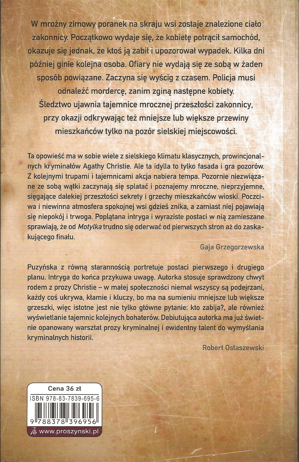 (...)..w którym ugryzłam Puzyńską. Doskonale skonstruowany kryminał, gęsta atmosfera małej społeczności i zagadki z przeszłości, które nigdy nie miały ujrzeć światła dziennego. W mroźny zimowy poranek na skraju mazurskiej wsi zostaje znalezione ciało zakonnicy. Początkowo wydaje się, że kobietę potrącił samochód. Szybko okazuje się jednak, że ktoś ją zabił i potem upozorował wypadek. Kilka dni później ginie kolejna osoba. Ofiary nie wydają się być ze sobą w żaden sposób związane. Zaczyna się wyścig z czasem. Policja musi odnaleźć mordercę, zanim zginą następne kobiety. Śledztwo ujawnia tajemnice mrocznej przeszłości zakonnicy, przy okazji odkrywając też mniejsze lub większe przewiny mieszkańców sielskiej – tylko na pozór – miejscowości. „Motylek” oderwał mnie od życia na niecałą dobę. Świetnie napisana powieść, pełna intryg, tajemnic, niedomówień. Sekrety przeplatają się ze sobą i są dawkowane (dosłownie) tak zdawkowo, że nie mogłam odłożyć książki i pójść zwyczajnie spać. No nie i już. Tak się nie dało. Kasia stworzyła wielowątkową fabułę, naszpikowała ją mnóstwem poszlak i zwodniczymi zakrętami wśród leśnych ścieżek, że można było się czasem zgubić. „Motylek” bezpardonowo obnaża życie w małej wiejskiej społeczności. Wiadomo nie od dziś, że w takich mieścinach wszyscy o wszystkich wiedzą lepiej i więcej niż sam zainteresowany. Ja na co dzień (chociaż w takowej wsi mieszkam) nie odczuwam tego – może dlatego, że nieco się izoluję od całej reszty. Jednakże nie wątpię w to, że mieszkańcy N. znają mnie lepiej niż ja. Czytając „Motylka” zastanawiałam się nie raz i nie dwa jakie sekrety skrywają moi sąsiedzi? Co trzymają w stodole pod stertą siana? Takie i inne dziwne pytania zadawałam sobie po lekturze. A to oznacza tylko jedno. Kasia Puzyńska napisała dobry kawał kryminału – który w mojej głowie narobił bałaganu. Co więcej...mam wokół siebie praktycznie same lasy. Wierzcie lub nie – ale po przeczytaniu „Motylka” spacery z psem pośród leśnych ostępów nabrały nowego wydźwięku. Tryb czujność… „Motylek” napisany jest swobodnym językiem, dialogi są realistyczne, bohaterzy autentyczni, a opisy miejscowych uroków idealnie wyważone, nie są za długie ani zbyt pobieżne, nie zanudzają i nie przysłaniają najważniejszej akcji. Okazuje się, że pod kurtyną sielankowej małomiasteczkowości aż grzmi od plotek i ukrywanych grzeszków. Autorka, moim zdaniem, bardzo dobrze to wszystko zobrazowała, pomieszała, poplątała i wyprowadziła mnie na manowce. Oczywiście jak to zawsze czynię, próbuję rozwiązać śledztwo na własną rękę – obstawiałam kilka postaci, które niestety wraz z rozwojem akcji musiałam wykreślać z mojej listy potencjalnych morderców. Zakończenie i wyjawienie modus operandi – jest niespodziewane, chociaż w sumie mogłam się tego domyślić, zamiast wybierać zbyt oczywiste rozwiązanie zagadki. Bohaterowie jak wspomniałam, są wykreowani nad wyraz plastycznie, są zwykłymi ludźmi pełnymi wad i zalet. Udało mi się z nimi zaprzyjaźnić. A zapach ciasta pani Podgórskiej czułam w całym domu. Nawet nieprzystępna komisarz Klementyna Kopp wzbudziła moją sympatię, chociaż sposób jej wysławiania się działał mi dość często na nerwy. Bardzo nie lubię, kiedy kończy swoje zdania wyrazem „co?” lub rozpoczyna je od słów „stop”, czy stosuje ciągłe powtórzenia np. "Czekaj. Spoko. Ale!" - zaburza to kompletnie znaną mi stylistykę polską i dialogi prowadzone przez panią komisarz budzą we mnie lekką irytację. „Motylek” można uznać za mocny debiut autorki, ponieważ niewątpliwie podjęła się trudnego tematu, wszak dobry kryminał rządzi się swoistymi prawami. Niemniej jednak uważam, że Kasia sprostała temu zadaniu. Oceniając całokształt tej wielowątkowej i wielopostaciowej powieści sądzę, że autorka poradziła sobie z tematem niemal perfekcyjnie, niemal gdyż nie obyło się bez drobnych wpadek, które jednak niezbyt rzutują na całą resztę. Z wielką przyjemnością zasiądę do lektury kolejnych tomów cyklu Lipowo. Bardzo jestem ciekawa jak potoczą się dalsze losy bohaterów w rozpoczętych wątkach obyczajowych. Kim jest tajemnicza Teresa? Czy związek Daniela i Weroniki ma szansę na pomyślny rozwój? Dlaczego komisarz Klementyna jest taka osobliwa? Cieszę się również, że śledząc kolejne losy mieszkańców Lipowa i okolic – będę miała okazję obserwować proces rozwoju i dojrzewania warsztatu pisarskiego autorki. „Motylek” to lektura warta uwagi i poświęconego na nią czasu.