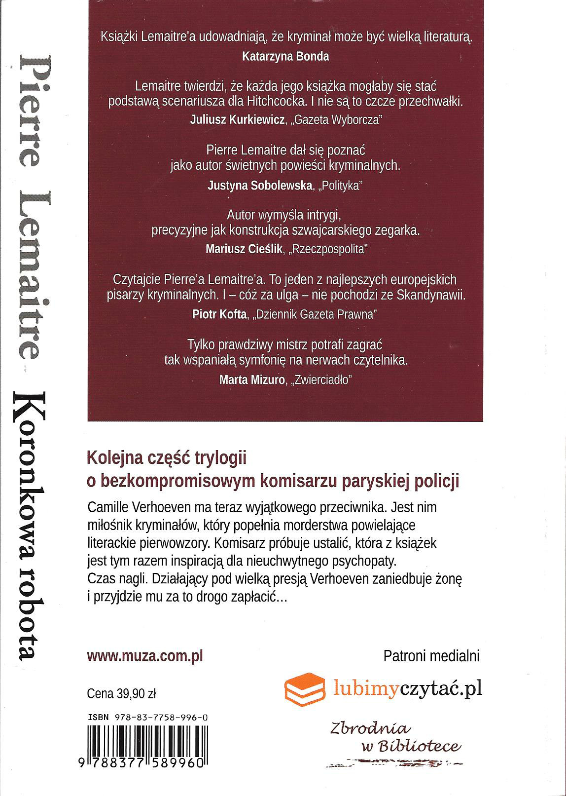 Camille Verhoeven ma teraz wyjątkowego przeciwnika. Jest nim miłośnik kryminałów, który popełnia morderstwa powielające literackie pierwowzory. Komisarz próbuje ustalić, która z książek jest tym razem inspiracją dla nieuchwytnego psychopaty. Czas nagli. Działający pod wielką presją Verhoeven zaniedbuje żonę i przyjdzie mu za to drogo zapłacić... [Muza, 2015]
