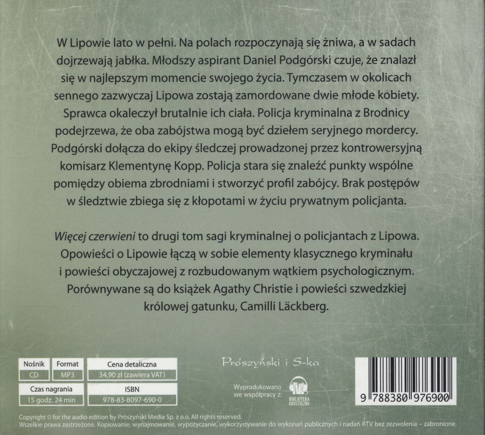 „Więcej czerwieni” to drugi tom cyklu Lipowo autorstwa Katarzyny Puzyńskiej, za który zabrałam rzutem na taśmę zaraz po przeczytaniu „Motylka”, którego akcja wciągnęła mnie na tyle, że nie potrafiłam sobie odmówić tej przyjemności. W Lipowie lato w pełni. Na polach rozpoczynają się żniwa, a w sadach dojrzewają jabłka. Młodszy aspirant Daniel Podgórski czuje, że znalazł się w najlepszym momencie swojego życia.