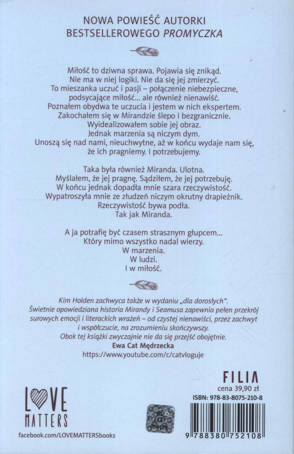 Jak już pisałam, powieść jest na jeden wieczór, jednak bohaterowie pozostają z nami na dłużej. Nie codziennie spotyka się blondynkę z głową usianą dredami i przystojnym Seamusem, więc gdy raz się z nimi spotkamy nie potrafią nas opuścić. Historia pozostawia mi trochę do życzenia, jednak co tutaj dużo mówić – jestem naprawdę pozytywnie nastawiona do twórczości Kim Holden i na pewno nie będzie to moje ostatnie spotkanie z nią.
