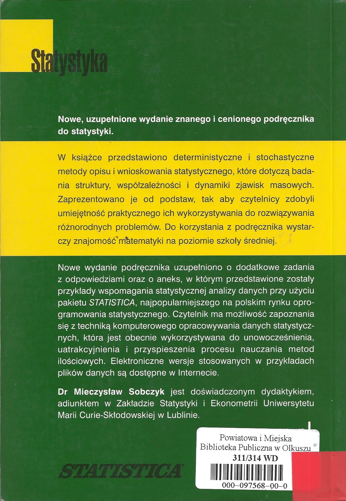 Statystyka / Mieczysław Sobczyk. - Wyd. 5 uzup. - Warszawa : Wydawnictwo Naukowe PWN, 2007. - 426, [2] s. : il. ; 20 cm.