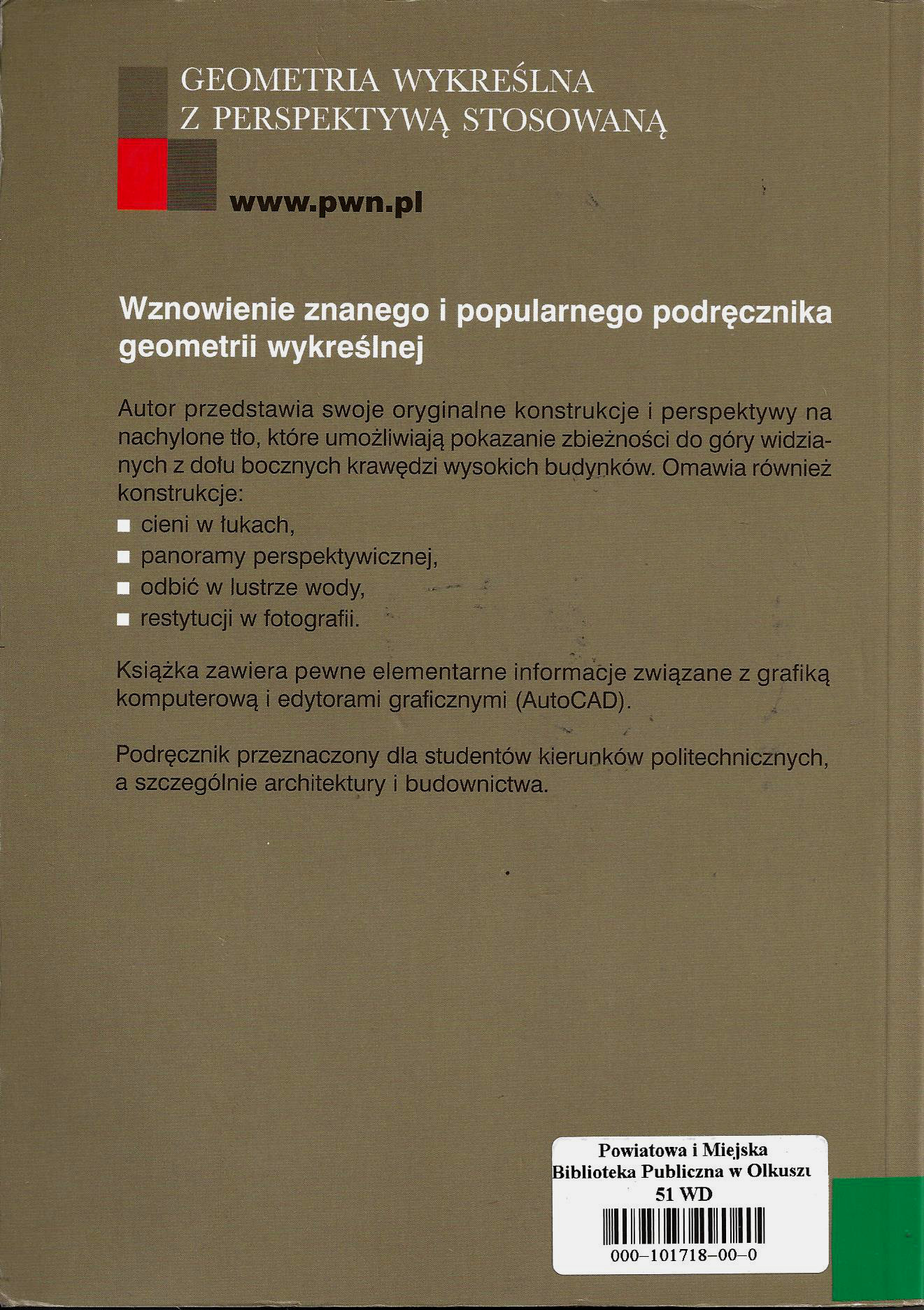Geometria wykreślna z perspektywą stosowaną / Bogusław Grochowski. - Wyd. 6, 4 dodruk. - Warszawa : Wydaw. Naukowe PWN, 2008. - 331, [1] s. : il. ; 24 cm.