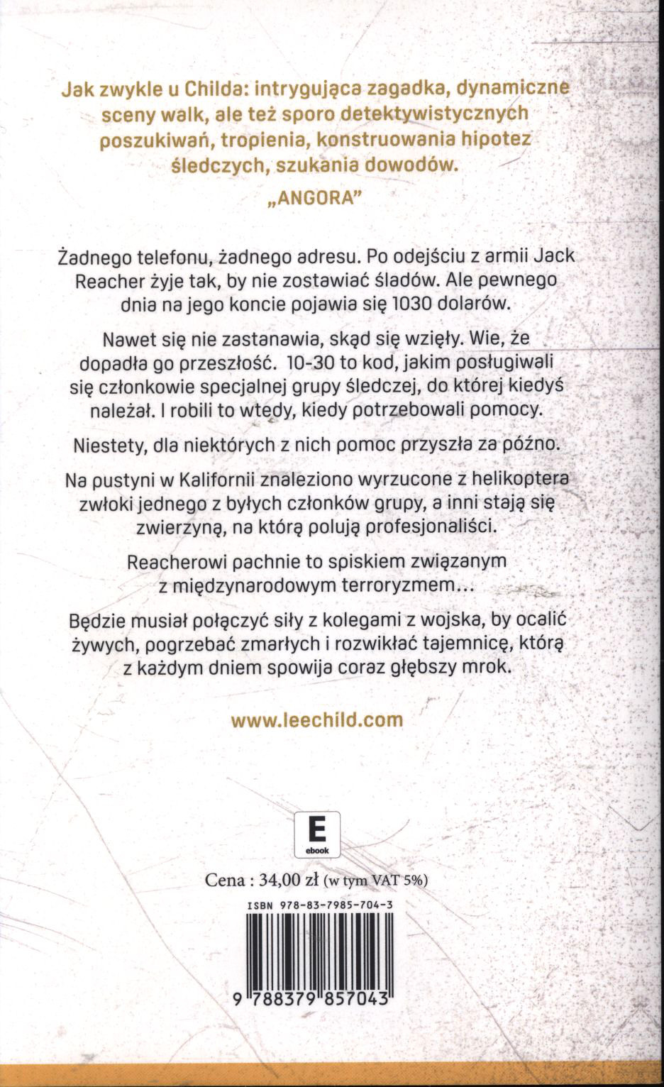Cykl Jack Reacher: 0 Adres nieznany, 1 Poziom śmierci, 2 Uprowadzony, 3 Wróg bez twarzy, 4 Podejrzany, 5 Echo w płomieniach, 6 W tajnej służbie, 7 Siła perswazji, 8 Nieprzyjaciel, 9 Jednym strzałem 10 Bez litości, 11 Elita zabójców, 12 Nic do stracenia, 13 Jutro możesz zniknąć, 14 61 godzin, 15 Czasami warto umrzeć, 16 Ostatnia sprawa, 17 Poszukiwany, 18 Nigdy nie wracaj, 19 Sprawa osobista, 20 Zmuś mnie, 21 Sto milionów dolarów, 22 Nocna runda, 23 Czas przeszły, 24 Zgodnie z planem, 25 Strażnik, 26 Lepiej już umrzeć, 27 Bez planu B, 28 Sekret, 29 Tajny raport